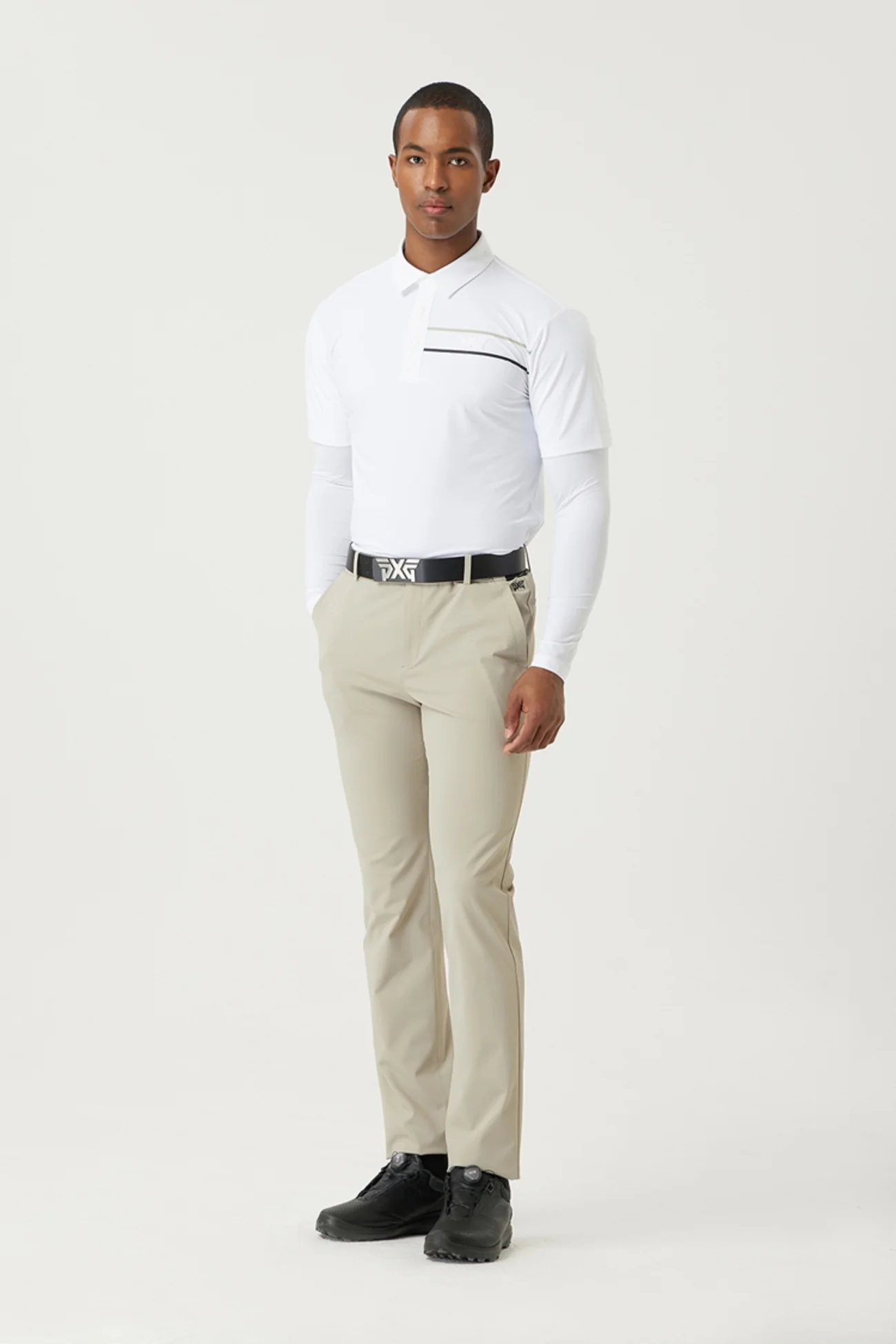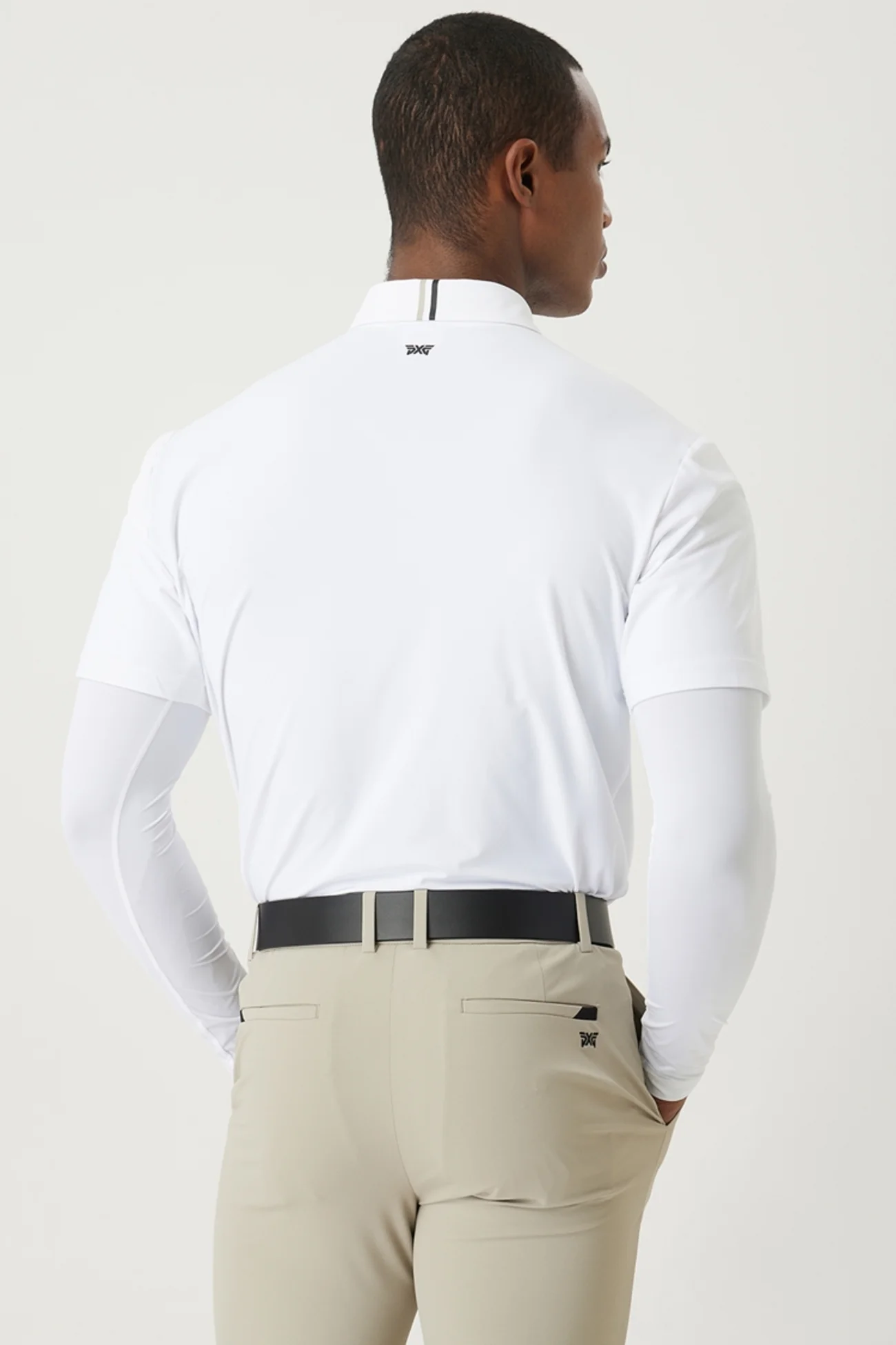 반팔 티셔츠에 냉감소매를 레이어드한 형태로 엣지있는 디자인 연출