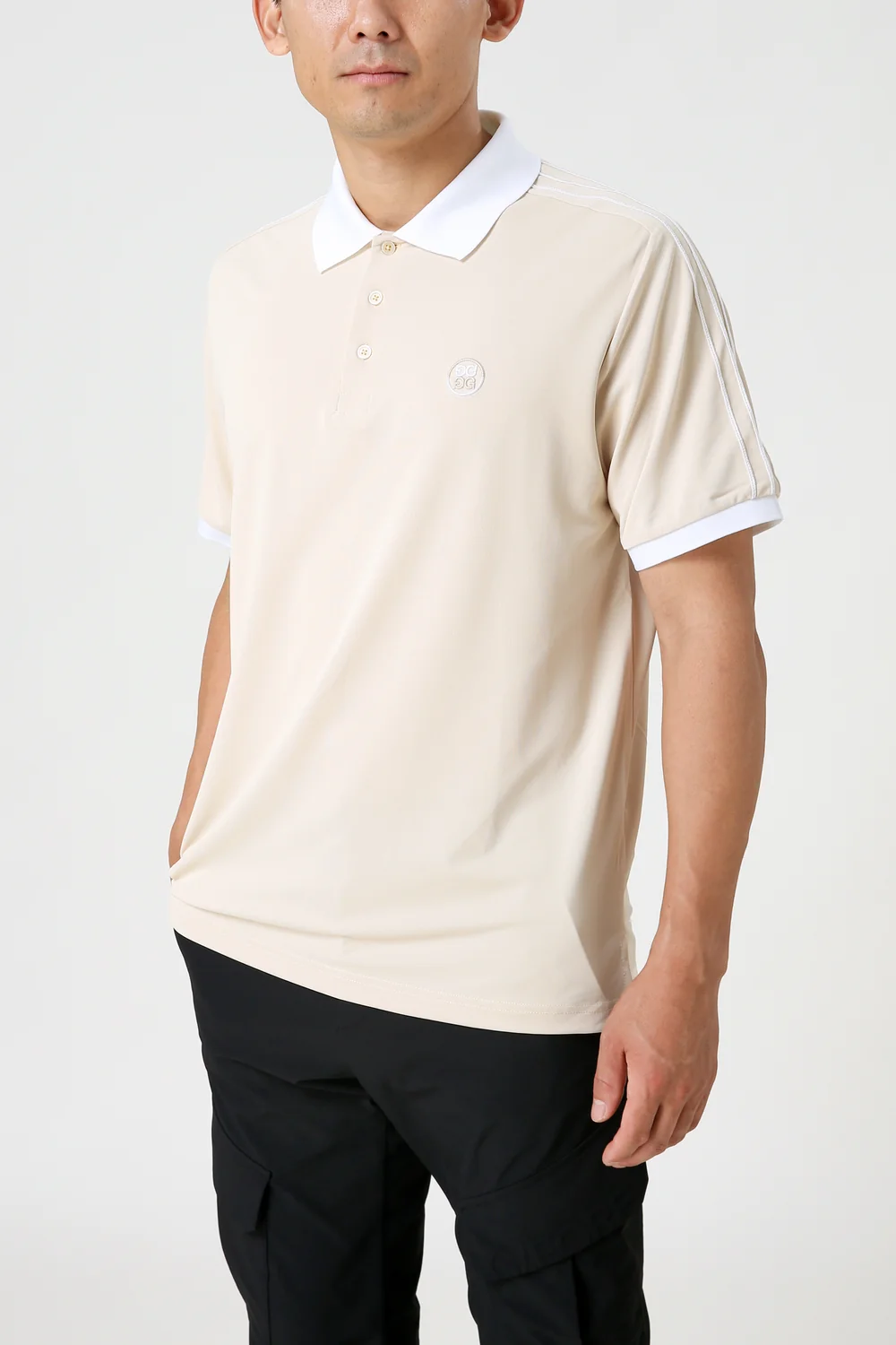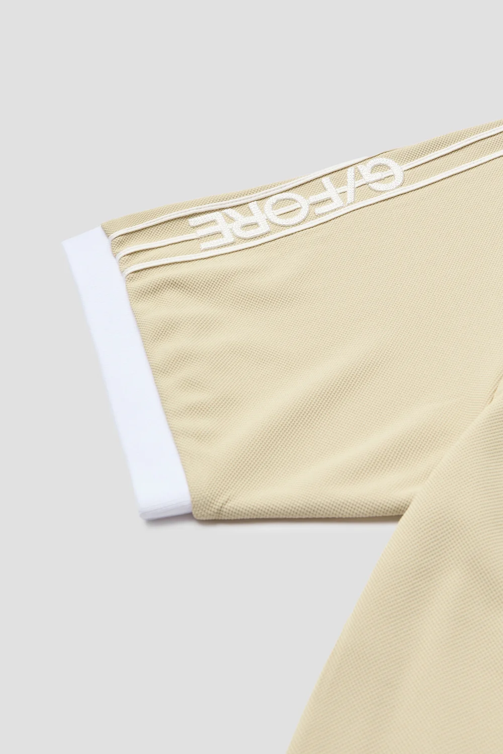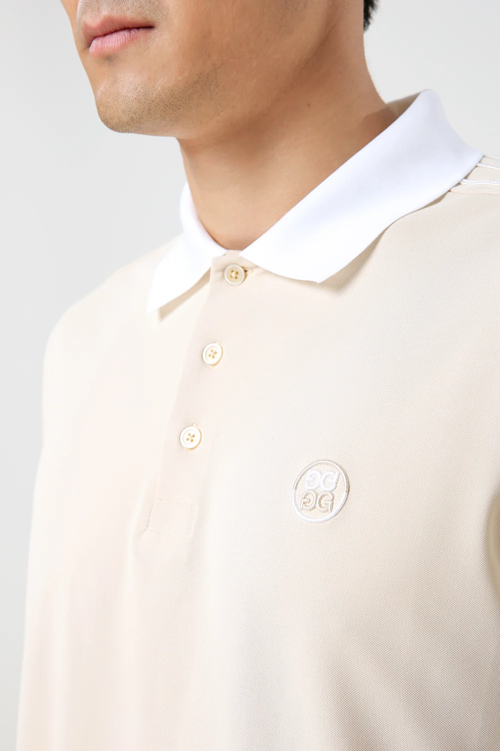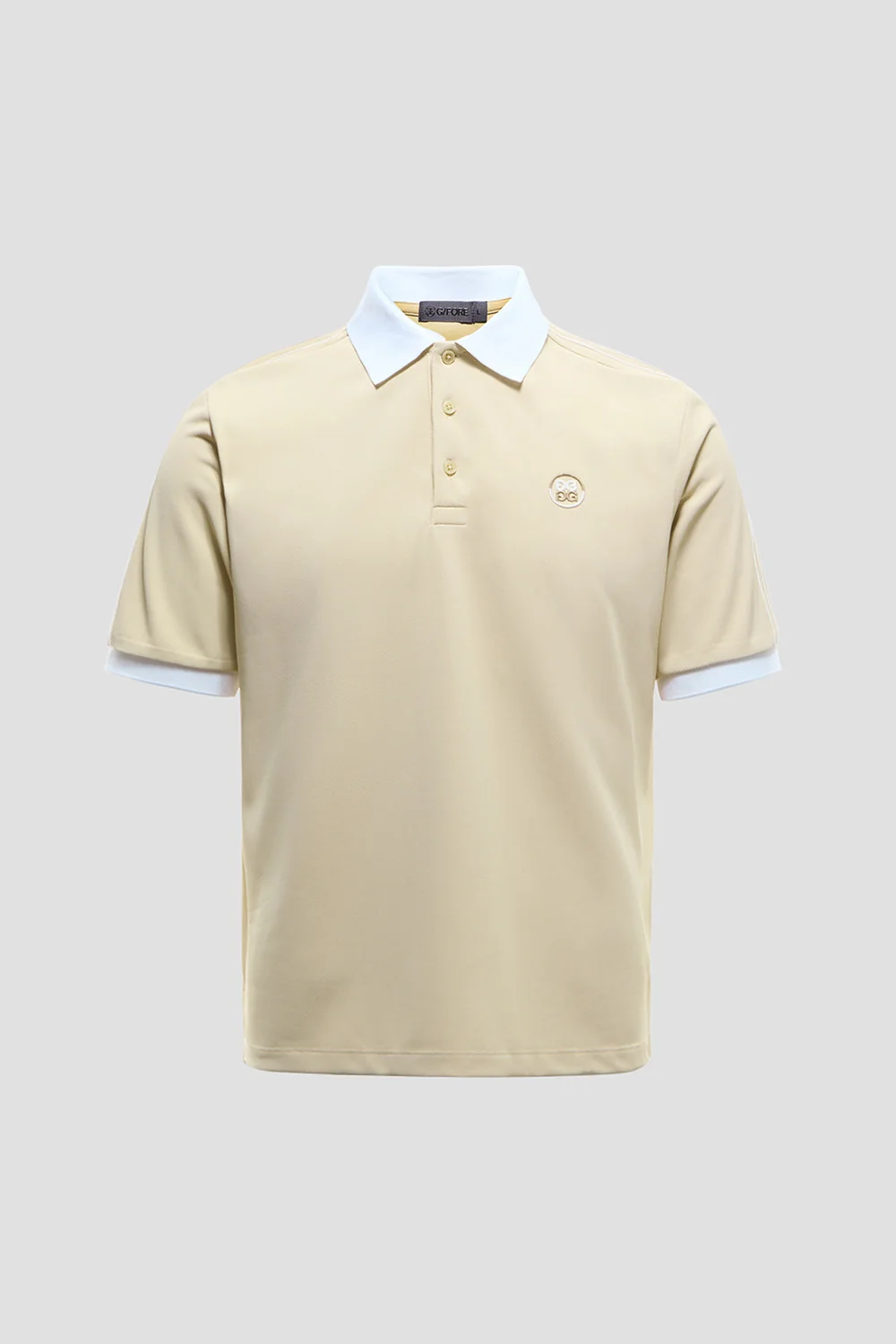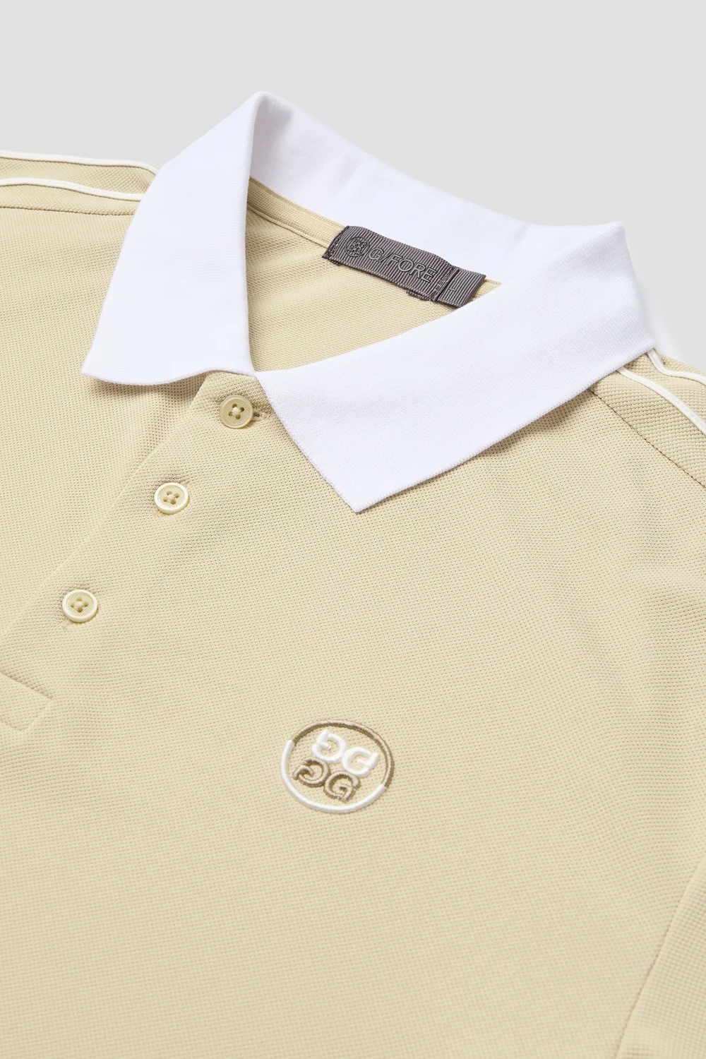 넥 라인부터 소매 끝까지 내려오는 컬러 블록 테이프에 G/FORE 볼륨 체인 자수 디테일을 더해 지포어만의 아이덴티티를 살림
