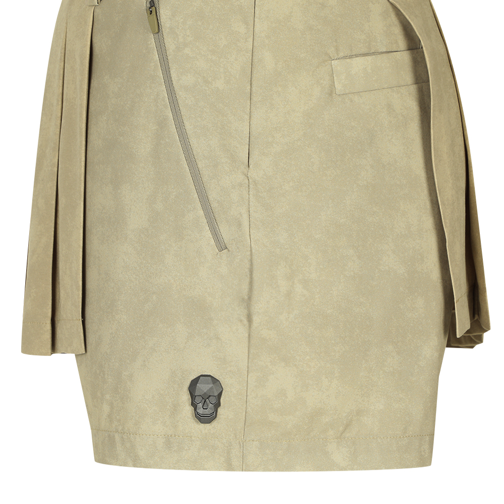 언발란스 기장의 덧댐 플리츠 디자인 포인트.