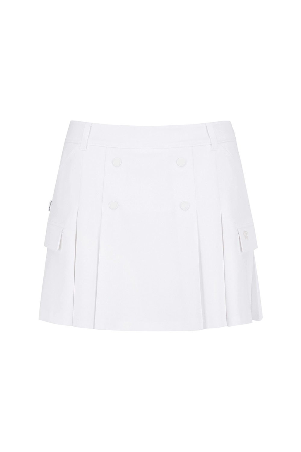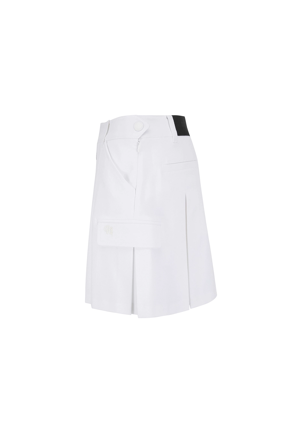 여성 더블 버튼 백 밴딩 큐롯 스커트 카고 디테일 플리츠 스커트. 허리 밴드가 내장되어 있고 신축성이 우수한 속바지가 부착되어 있어 활동성이 좋음. 카고 포켓 디테일로 수납이 용이함. 오링 디테일로 볼 파우치 탈착이 용이함. 테마: I♡PG 핏: 플리츠