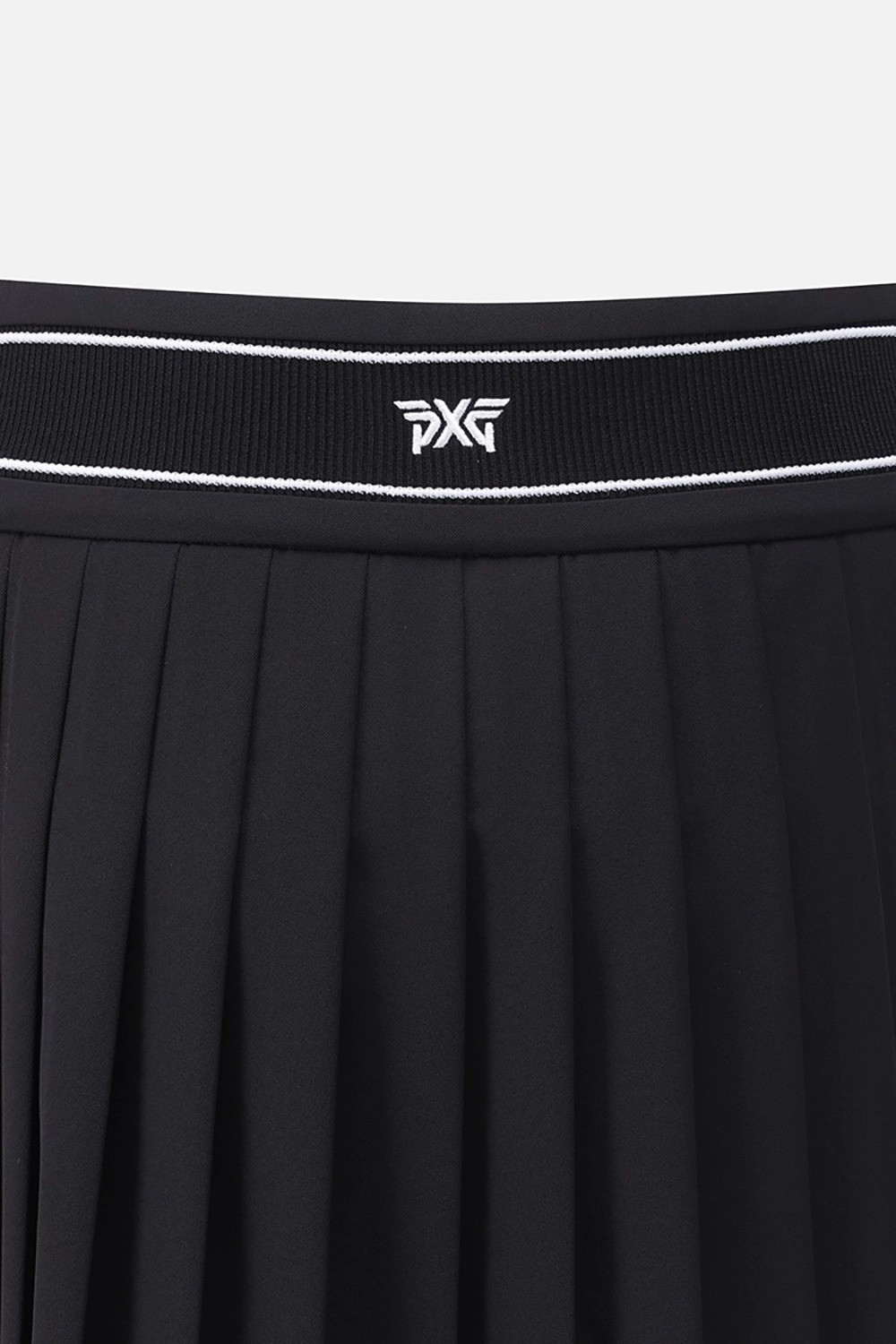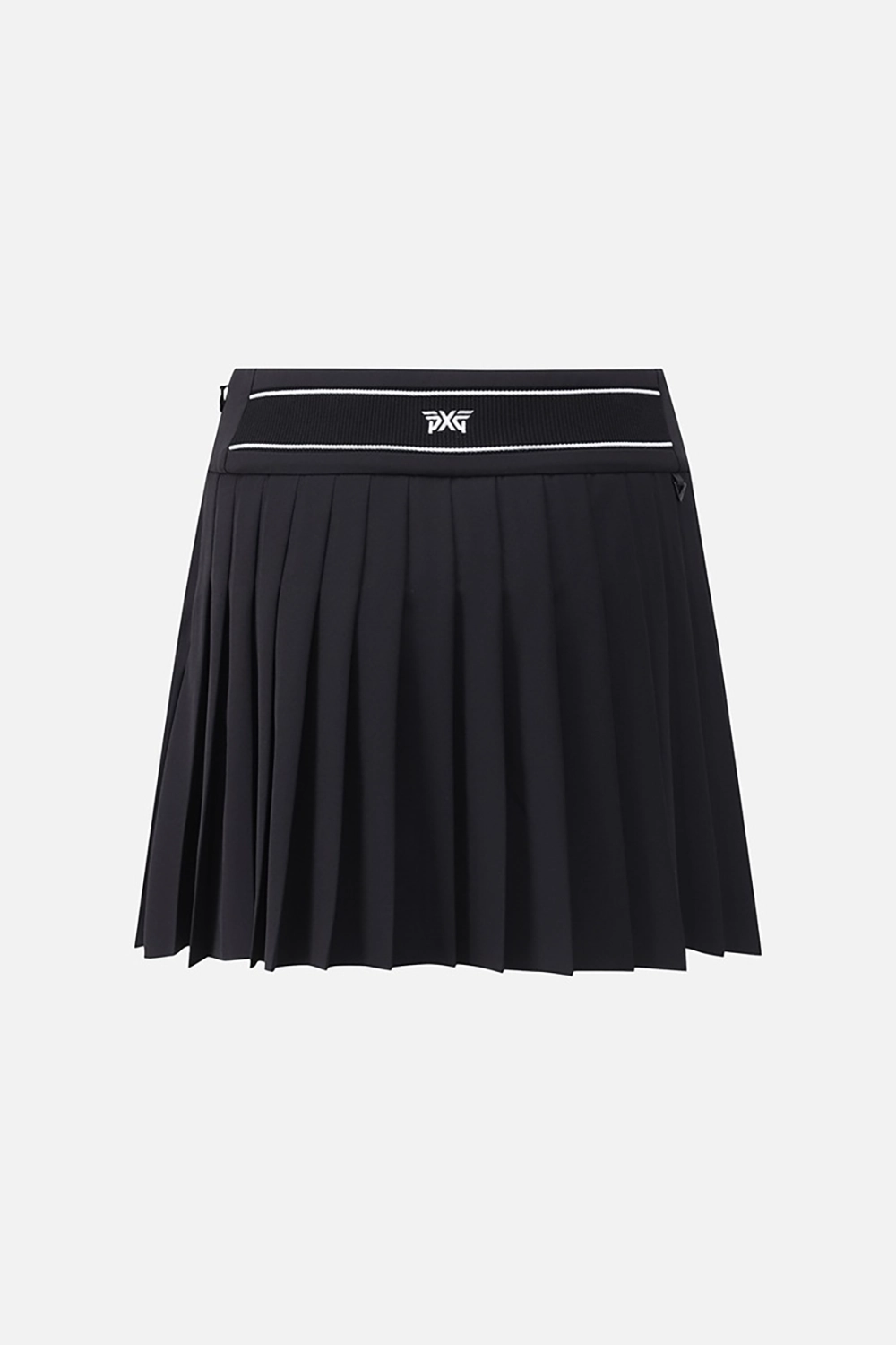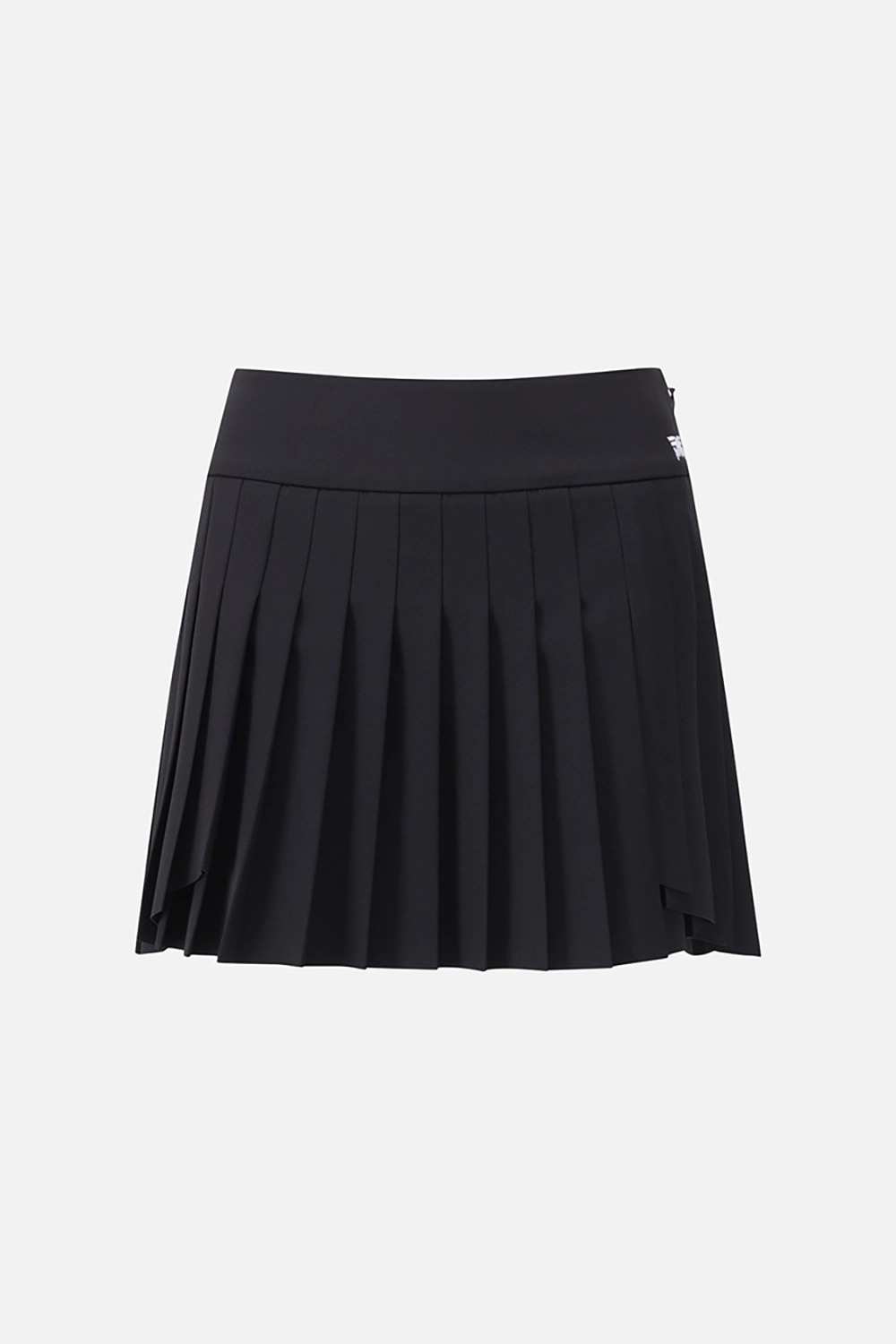 언발하게 떨어지는 플리츠와 뒷허리 로고 밴딩으로 디테일이 살아있는 디자인