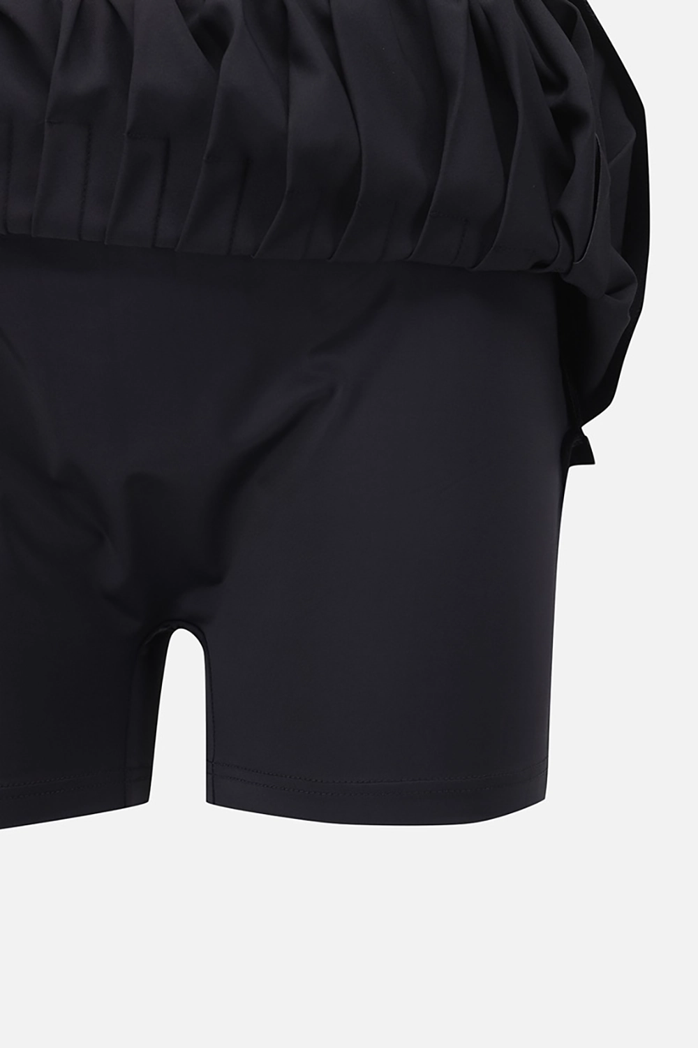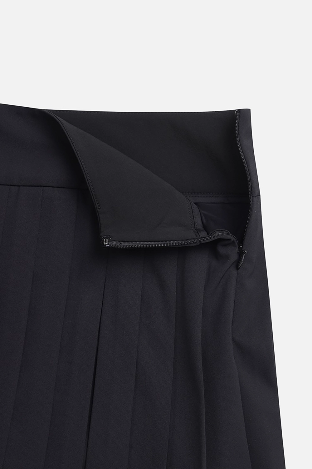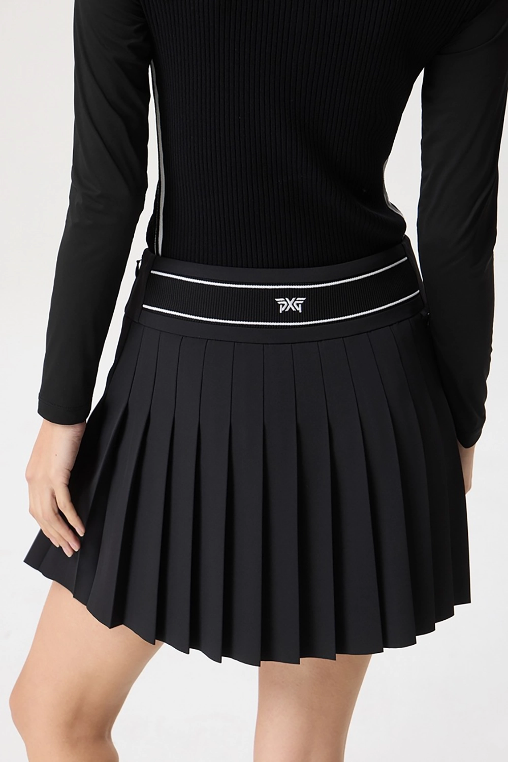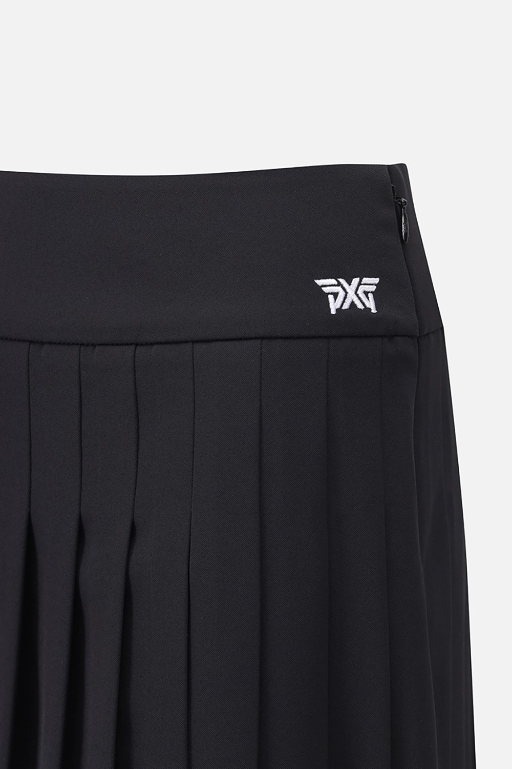 언발하게 떨어지는 플리츠와 뒷허리 로고 밴딩으로 디테일이 살아있는 디자인